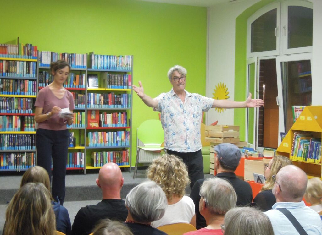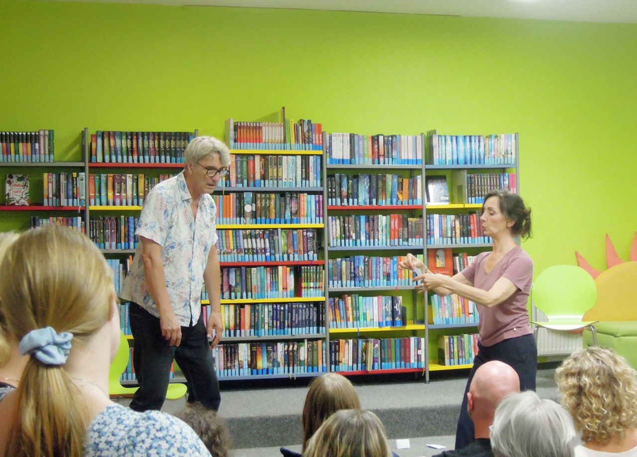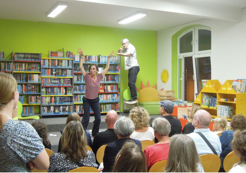 Das Theaterensemble „Die Gorillas“ spielt seit 1997 in Berlin in vielfältiger Weise Improvisationstheater. „Wir versuchen mit der Philosophie der Improvisation – Akzeptanz, Vertrauen, Ja-Sagen, Flexibilität, Zuhören und Weiterführen der Ideen des Anderen – unterhaltsame, theatrale Erlebnisse mit dem Ziel zu erschaffen, das Zusammenleben in unserer Gesellschaft zu beleben und zu verbessern. Wir erarbeiten Methoden, um Improvisation in sozialen, inter- kulturellen, therapeutischen, bildenden und Gemeinwohl fördernden Zusammenhängen nachhaltig zu verankern“. So stellt sich das Ensemble auf seiner Homepage vor. Und so war es beim Stadtevent 2025 im Spielort Stadtbibliothek: Improvisationstheater mit den Gorillas ist hautnah, unmittelbar, überraschend, lebendig und immer einmalig. Drei ausverkaufte Vorstellungen, die viel Spaß gemacht haben.